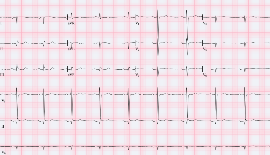 Bespreking: we zien een regelmatig ritme van circa 60/minuut. Elk QRS-complex wordt voorafgegaan door een P-top. De morfologie van die P-top is atypisch. Zo zie je in V1 dat de P-top er niet uitziet zoals je zou verwachten bij een sinusritme. Bij een normaal sinusritme is het eerste deel van de P-top in V1 positief en is het tweede deel negatief. Hier zien we een geheel positieve P-top in V1, met een afwijkend ‘hakkeltje’ (bifide P-top). De geleidingstijden (PQ, QRS, QT) zijn normaal – hoogstens is er een geringe aspecifieke ventriculaire geleidingsvertraging. De hartas is afwijkend. Deze wijst naar rechts (negatief in afleidingen I en II, maar positief in aVF). Het QRS-complex is in afleiding II (60 graden) iso-electrisch, dus de exacte hartas is 150 graden. De R-topprogressie is sterk afwijkend en traag (R wordt nergens dominant over de S). Er zijn geen ST-segmentdeviaties. Wel is de T-topmorfologie afwijkend; bijvoorbeeld is er een negatieve T in aVL. Overigens is in die afleiding dus ook het QRS-complex overwegend negatief, dus – zeker gezien de klinische context – berust dit vermoedelijk niet op een repolarisatiestoornis.