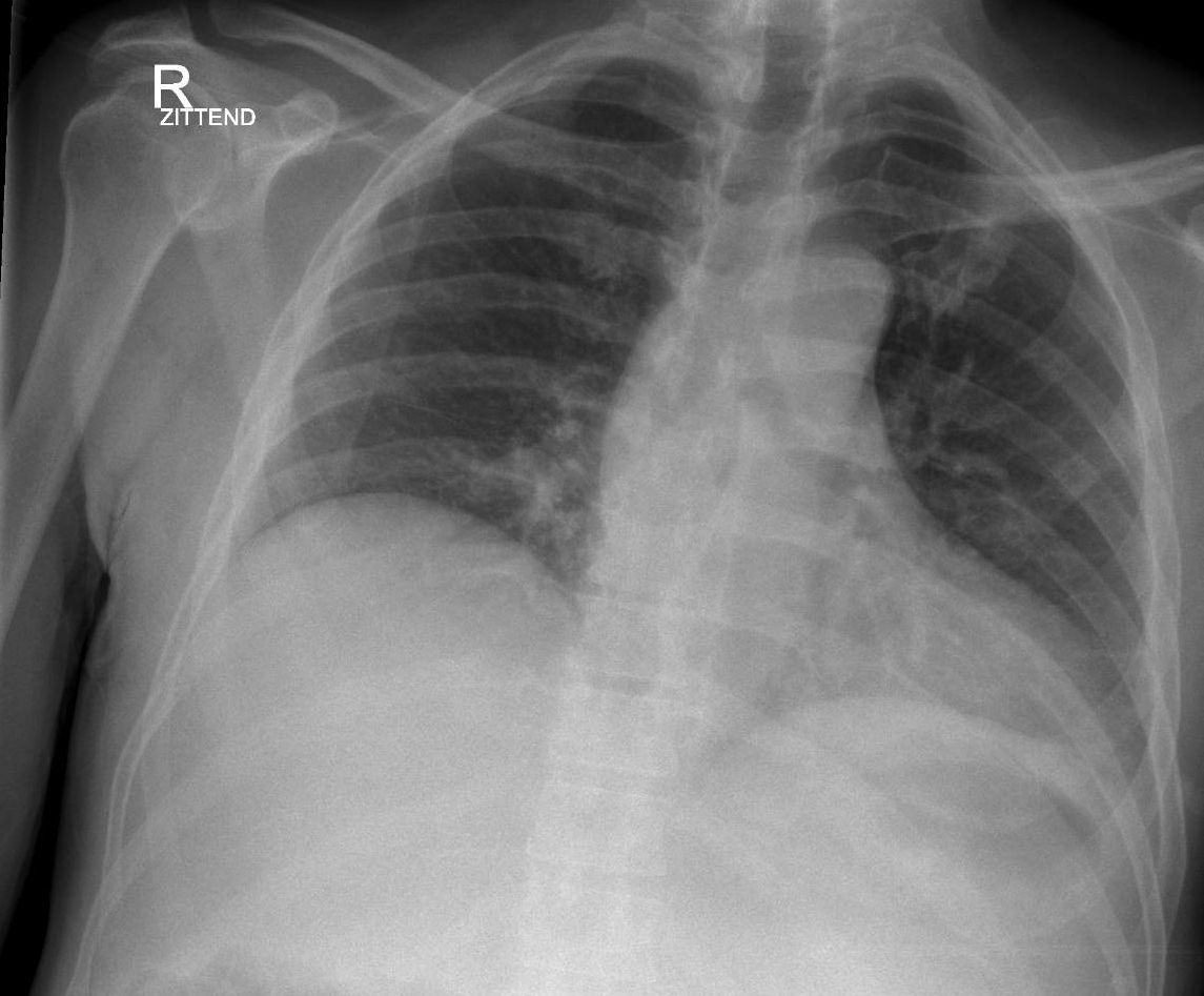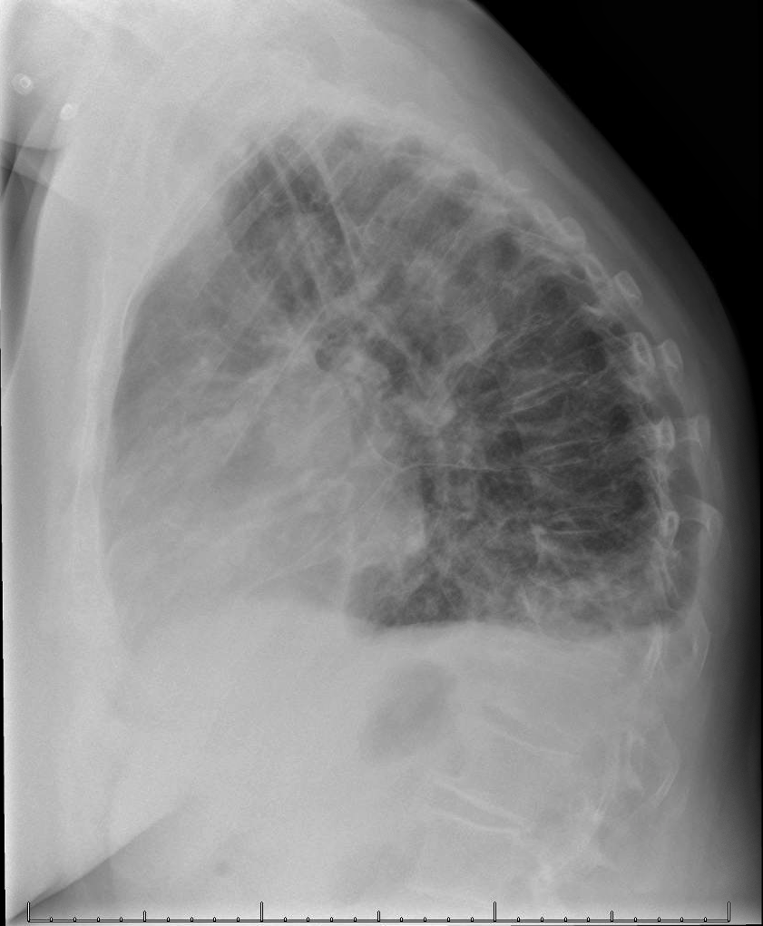 Als eerst zien we een PA en laterale foto van een patiënt met koorts, CRP en dyspnoe.Â