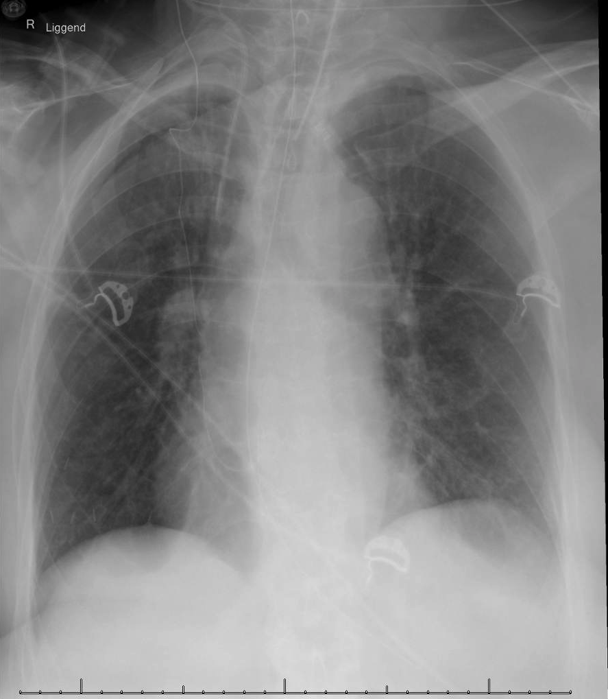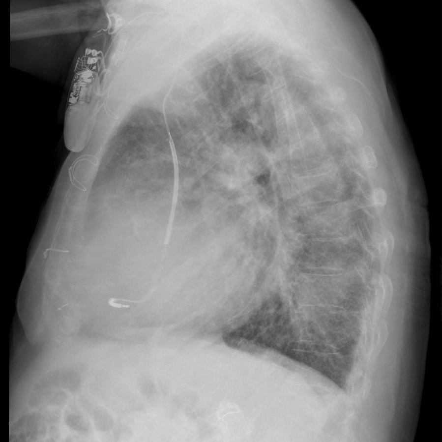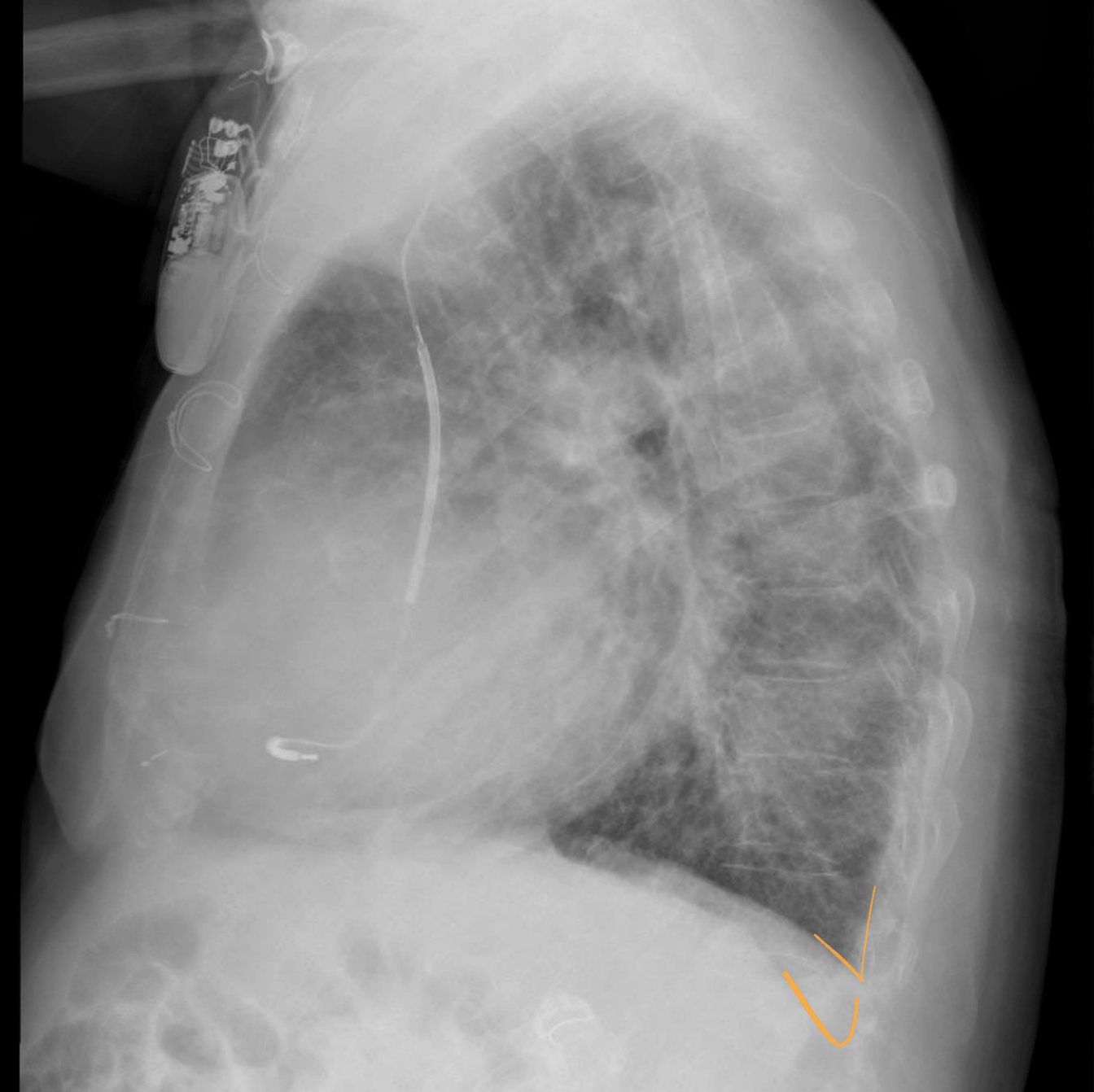 Onderstaand een PA-foto en een laterale foto. De inspiratiestand is redelijk. Je ziet een device met een draad waarvan de tip boven de rechterkamer projecteert. Is dit een pacemaker of een ICD? Juist, een ICD. Dat herken je aan de dikke schokspoelen (zie bovenstaand de uitleg). Het hart is duidelijk verbreed: de cor-thorax-ratio (oranje lijn gedeeld door groene lijn) is ruim boven de 0,5. Waardoor komt dit? Bij cardiale patiënten is vaak het meest voor de hand liggend een overvullingsbeeld. Bij deze patiënt zie je meerdere overvullingskenmerken. Zo zijn de blauw gemarkeerde witte lijntjes rechtsbasaal zijn typisch. Deze lijntjes komen door vocht in de interlobulaire septa en worden Kerley-B-lijntjes genoemd. Verder is de longvaattekening (zie bijvoorbeeld rood gemarkeerd een longvat) uitgesproken, met name basaal, en wat onscherp begrensd. Dit is een teken van longvaatovervulling. We zien geen significante hoeveelheid pleuravocht, de sinus pleurae zijn redelijk scherp afgrensbaar (zie ook de laterale opnamen, die zijn gevoeliger voor kleine effusies dan de frontale opnamen, omdat het diepste punt bij een staande patiënt de posterieure recessus is, en niet de laterale).Â
