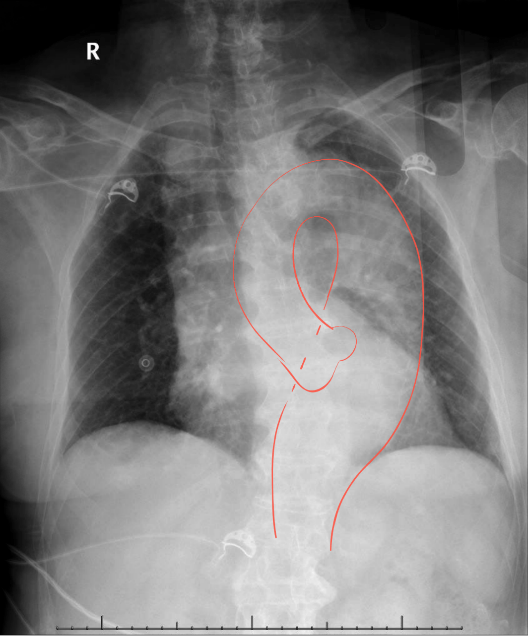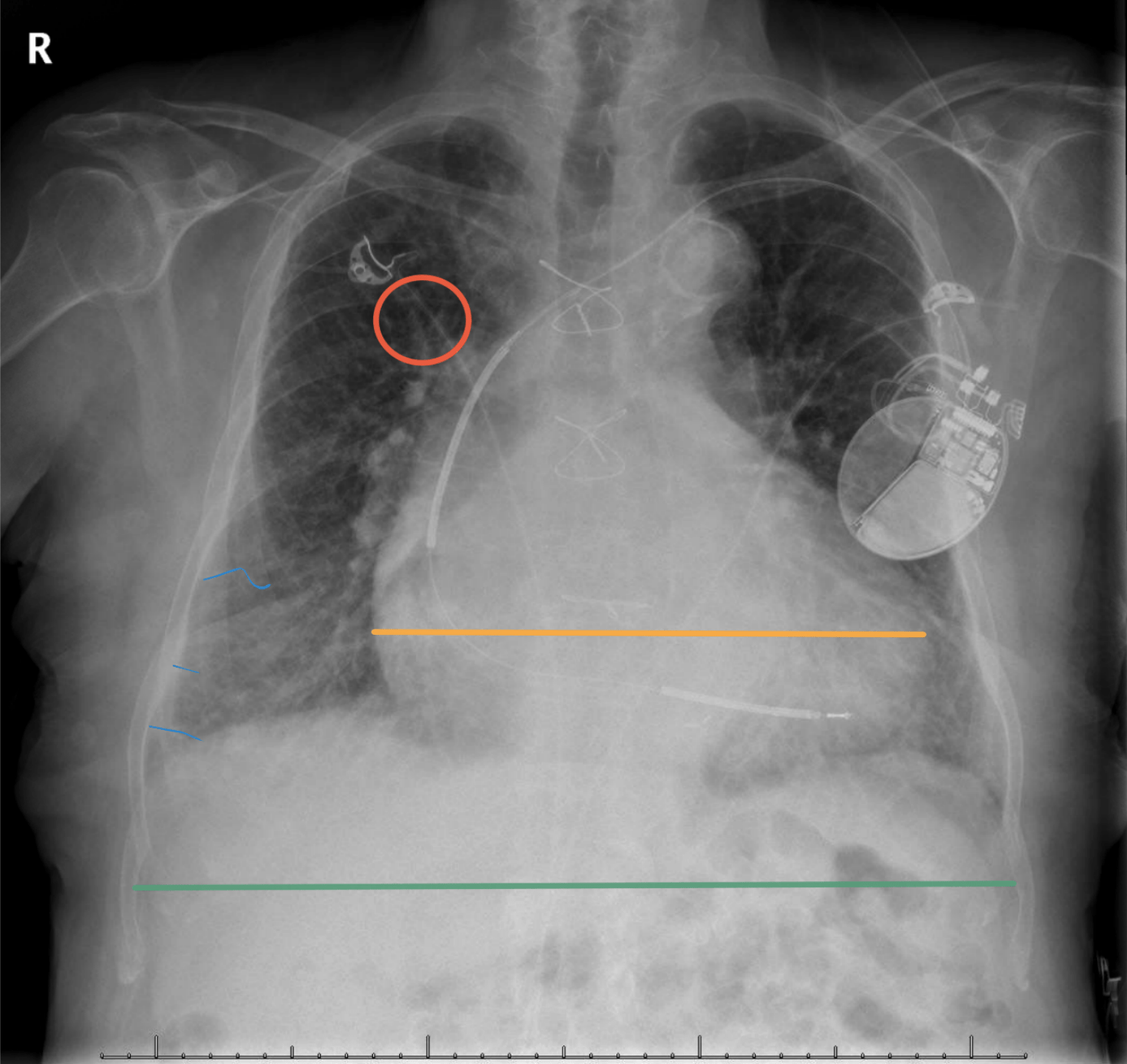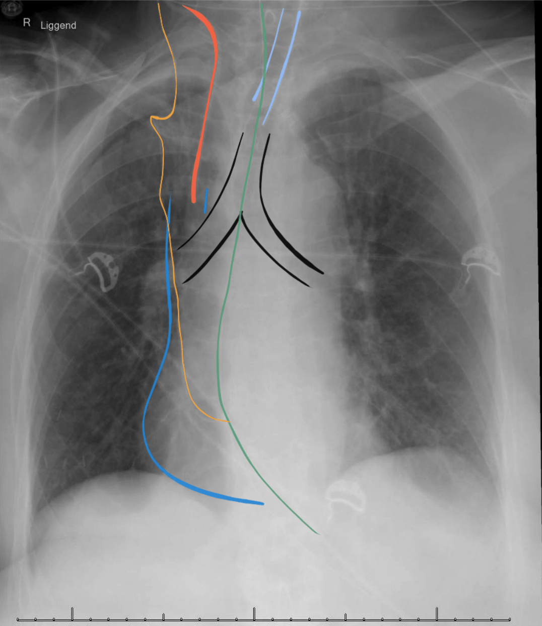 Scroll eens door de onderstaande thoraxfoto. Bovenstaande kleurgemarkeerde structuren vind je hier terug. De trachea is zwart gemarkeerd. De contour van de rechterboezem en vena cava superior is blauw. Geel-oranje zie je een epiduraalkatheter (wordt ingebracht in de epiduraalruimte voor pijnstilling – deze loopt dus grotendeels ‘buiten de patiënt’). De niet-gemarkeerde structuren zijn ECG-plakkers en bedrading.Â
