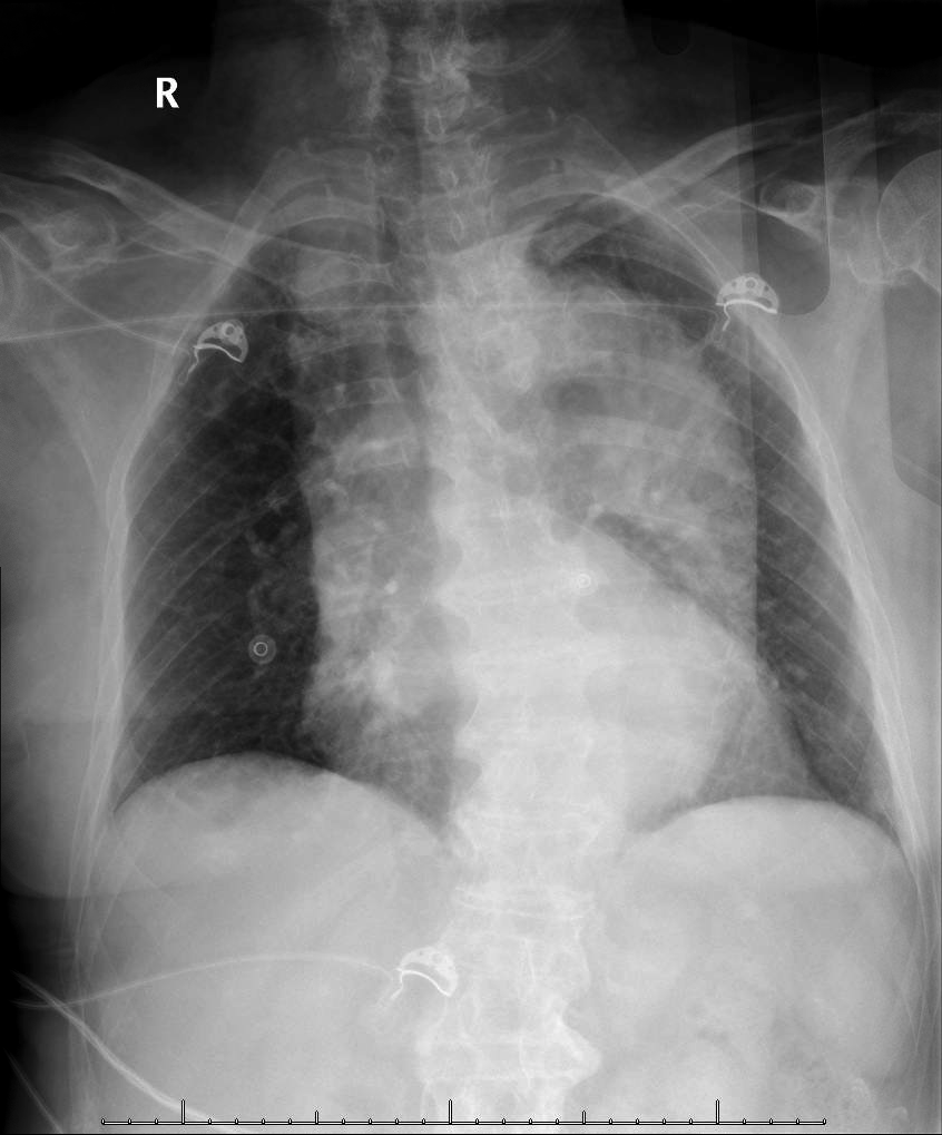 Een AP-thoraxfoto met goede inspiratiestand. Er kon geen laterale opname worden gemaakt.Â