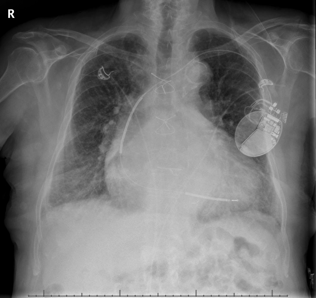 Dit is een pacemaker (geen dikke schokspoelen) met een draad die projecteert boven de rechterboezem en een draad die projecteert boven de rechterkamer (goede positie). Er is geen draadbreuk. Er projecteert nog een device over het hart, dit betreft een zogheten ‘Reveal device’, een apparaat met USB-component die aritmieën kan vaststellen.