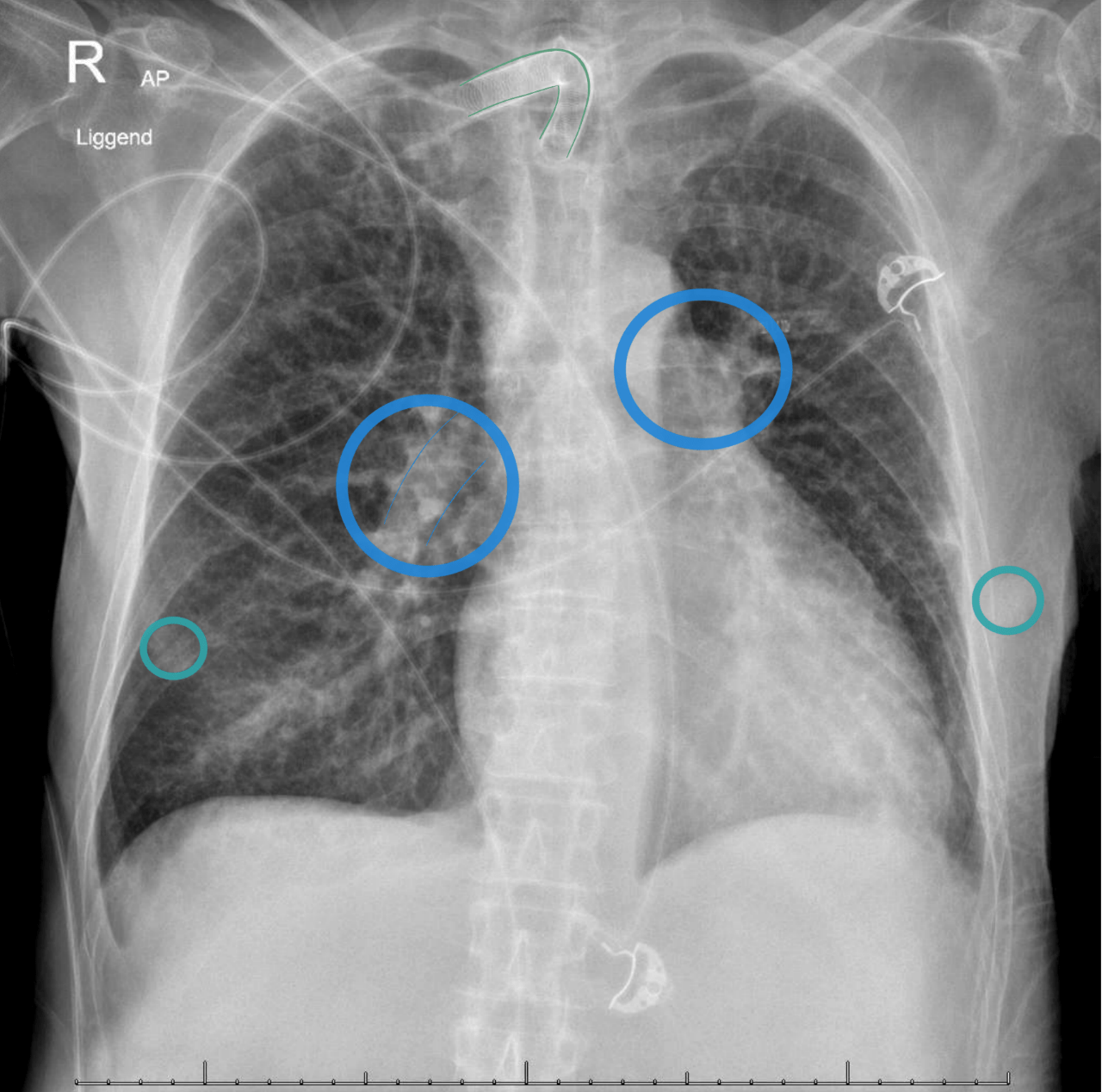 De eerste foto is een AP liggende opname met redelijke inspiratiestand. Het valt meteen op dat de foto ‘te wit’ is. Je ziet dat de hili (donkerblauw omcirkeld) prominent zijn. Je ziet hier dat het kaliber van de pulmonaalvaten perifeer nog vrij dik is, zeker vergeleken met de ontwaterde foto. Ook in de apicale longvelden zie je dikke vaatkabels lopen; dit fenomeen waarbij de longvaten door stuwing ook in de bovenvelden dik worden, wordt (vasculaire) redistributie genoemd.