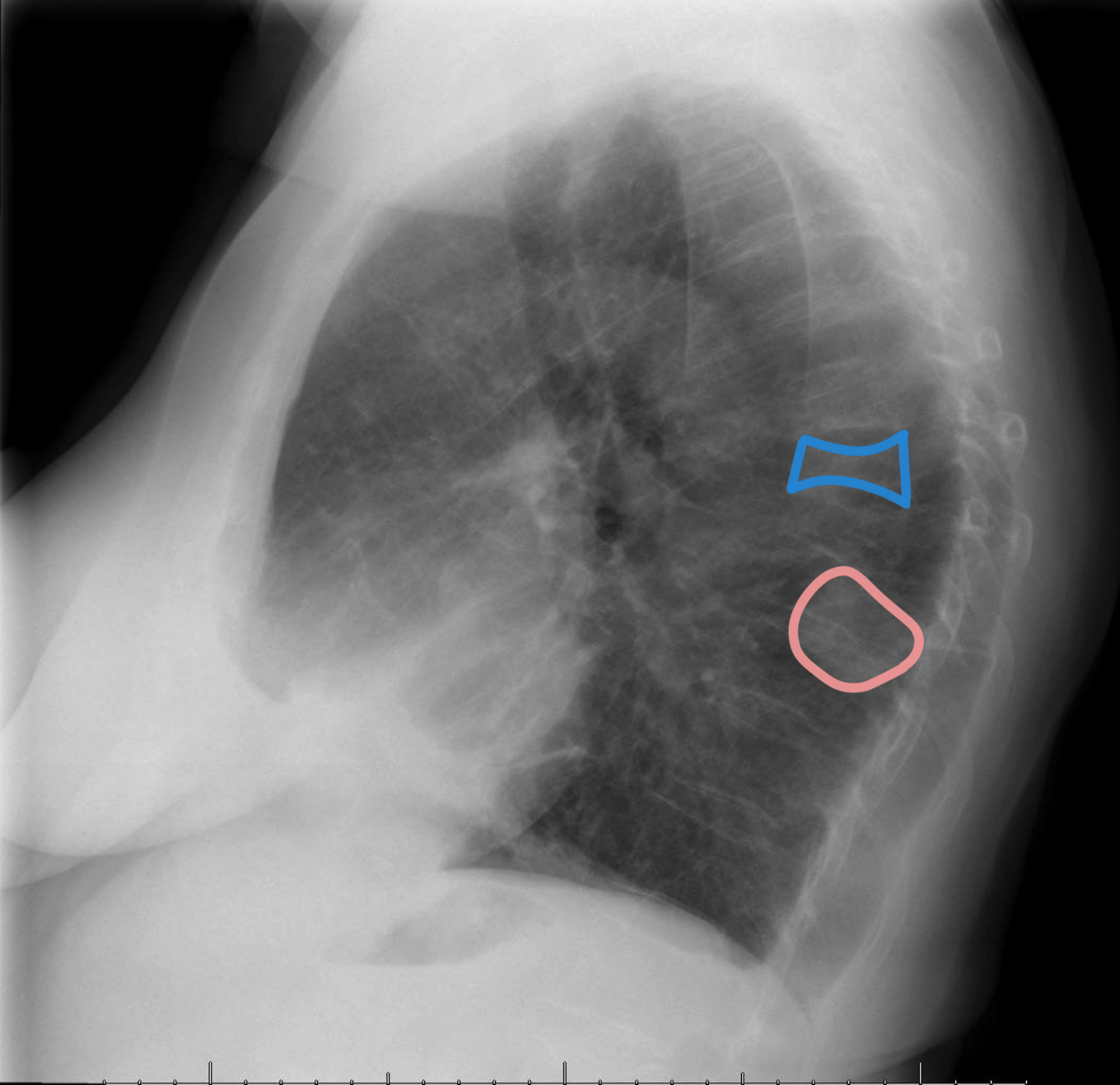 Waar je gemakkelijk overheen kunt kijken, is de bolronde verdichting die projecteert over het wervelkolom (rood omlijnd). De frontale opname (hier niet getoond) liet zien dat die verdichting in de rechterlong zit, het bleek een primaire maligniteit. Op de thoraxfoto waren er geen aanwijzingen voor ossale metastasen.Â