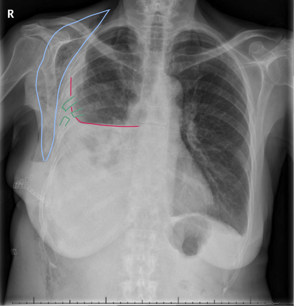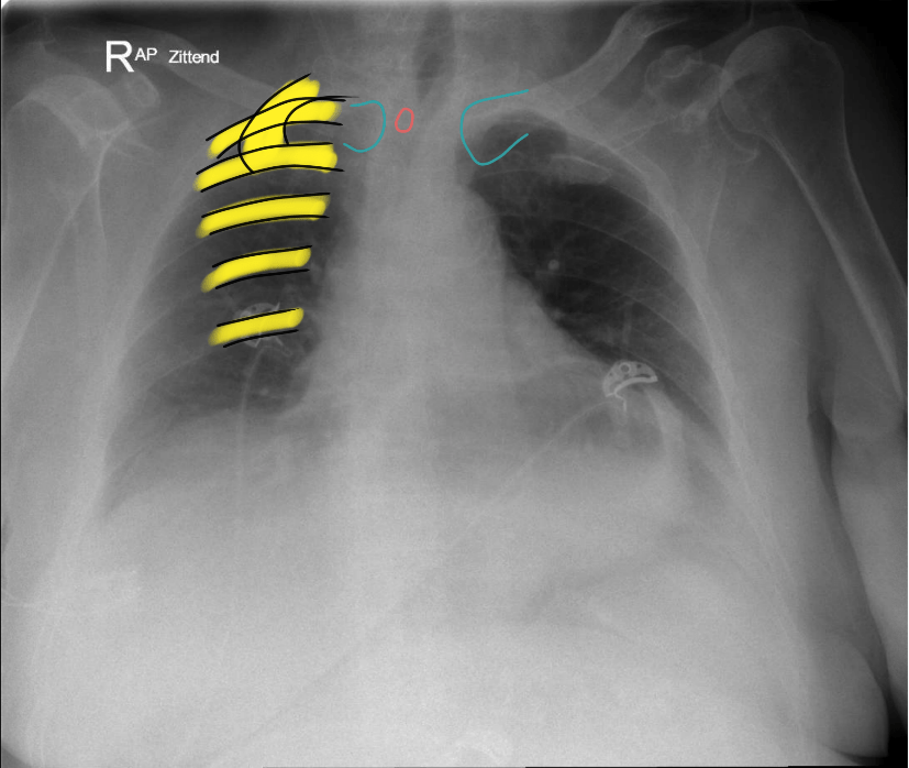 Je ziet dat er meerdere ribben aan de dorsolaterale zijde zijn onderbroken. We hebben er hier twee gemarkeerd (groen). Ribfracturen zijn vaak moeilijk te zien op een thoraxfoto en bij het vervaardigen van een CT-thorax blijken er dan meer te zijn.Â