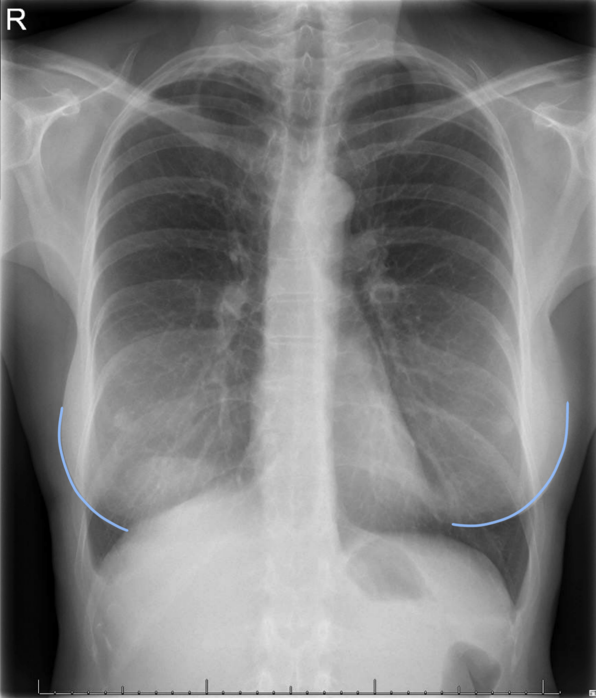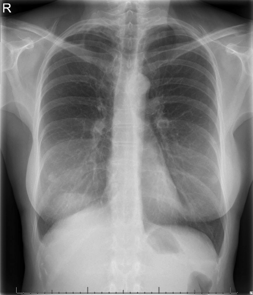 Wat vind je van de ondervelden op deze thoraxfoto? Wel wat ‘te wit’ zou je misschien zeggen. Wat is er aan de hand? Kijk je nog eens goed, dan zie je dat dit simpelweg de projectie is van de mammae!